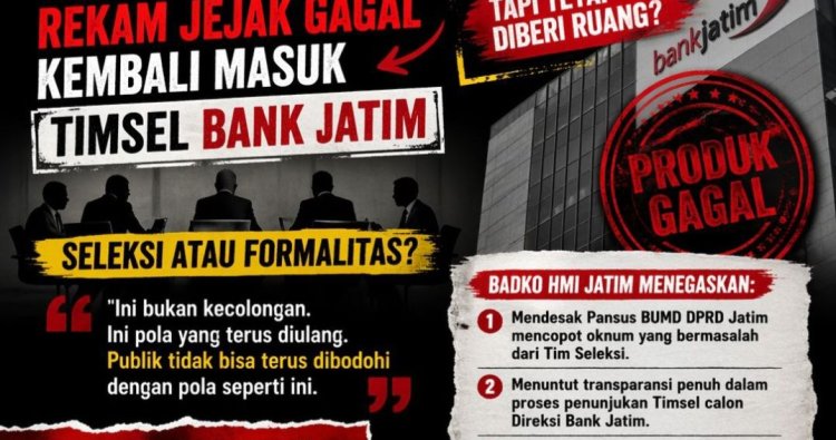 Pasalnya, oknum Komisaris Independen Bank Jatim yang sebelumnya terlibat dalam proses seleksi dan terbukti melahirkan “produk gagal”, justru kembali diberi ruang sebagai bagian dari Tim Seleksi (Timsel) calon direksi Bank Jatim.